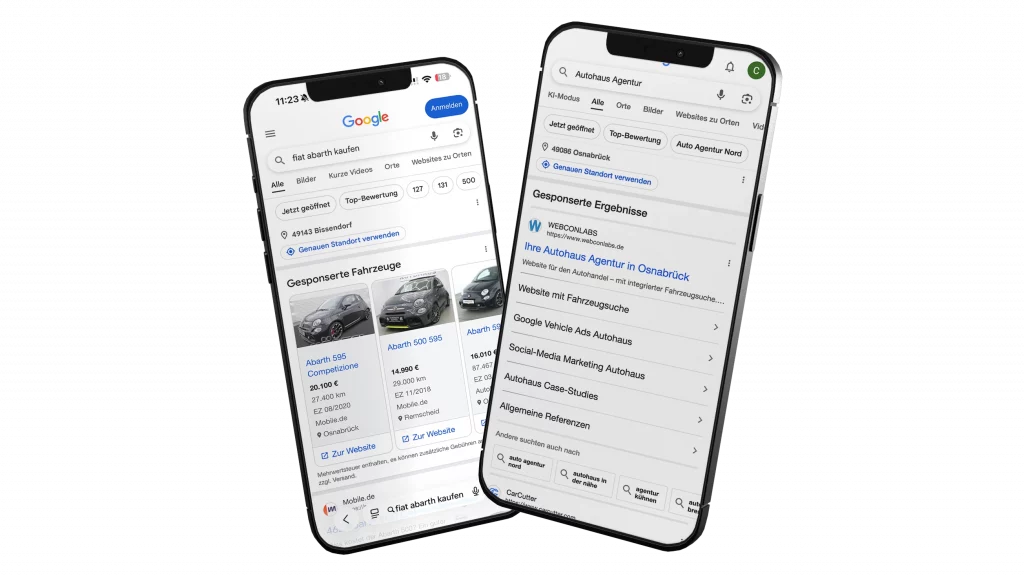 Sie zeigen, wie wir Autohäuser ganzheitlich unterstützen – von der Website mit integrierter Fahrzeugsuche über den automatischen Bestandsabgleich bis hin zu Google Ads, Vehicle Ads und Social-Media-Kampagnen.